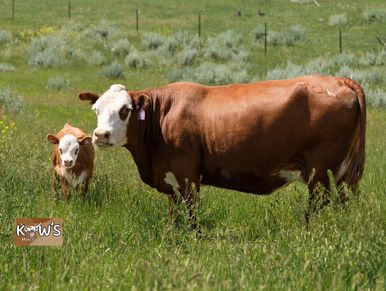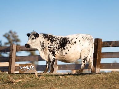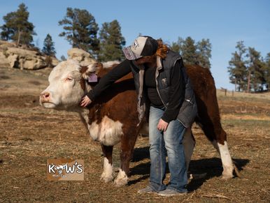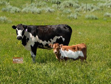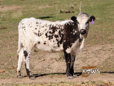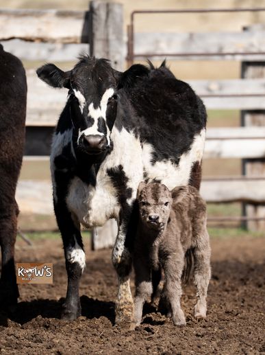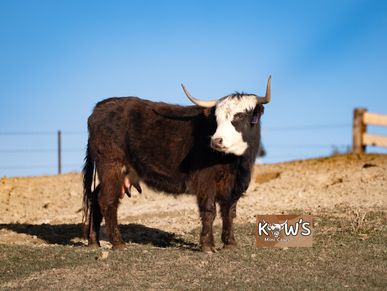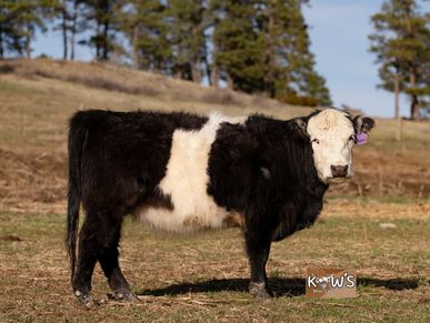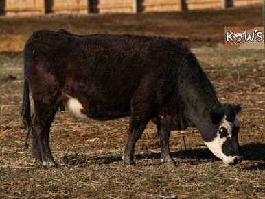Thelma is our other Pinzgauer cow! The Pinzgauer breed is originally from Austria and are known for their milk production and being good mothers! She was bred to KMC Teddy and produced a wonderful colorful calf!