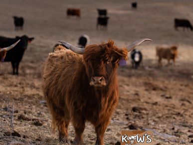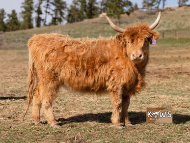 KMC Medusa. She is one of our Scottish Highland ladies that had her first calf this year (2025). She was bred to KMC Teddy and we got a beautiful dun calf out of her!