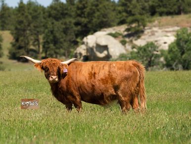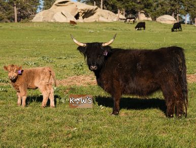 KMC Loretta is one of our brindle Scottish Highland ladies that has produced some tiny colorful babies! She was bred back to KMC Teddy this year.